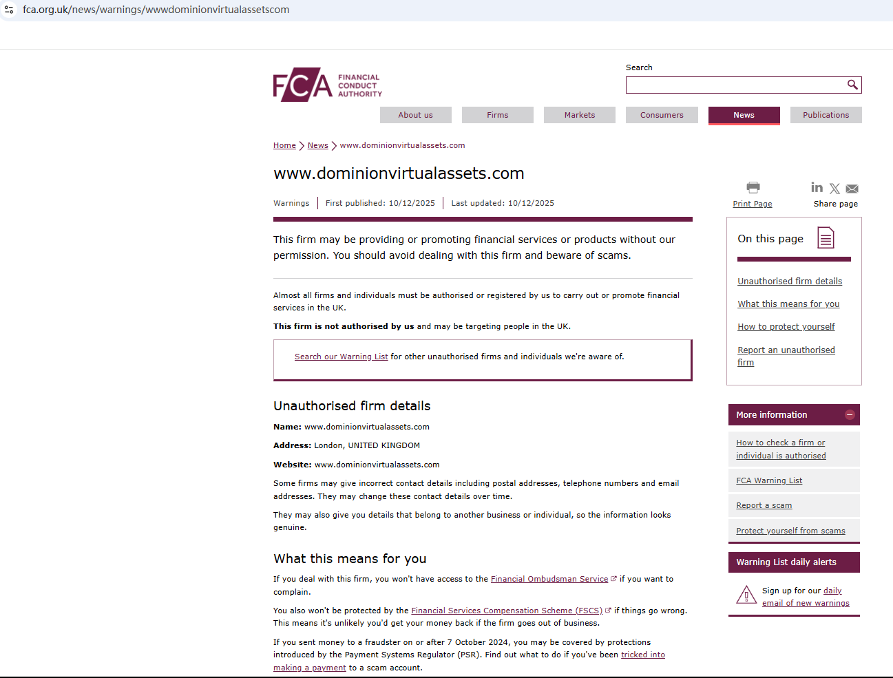 2025년 12월 10일, 영국 금융감독청(FCA)은 Dominionvirtualassets가 필요한 승인 없이 금융 서비스 또는 상품을 제공하고 있을 가능성이 있다는 이유로 경고를 발표했습니다. https://www.fca.org.uk/news/warnings/wwwdominionvirtualassetscom