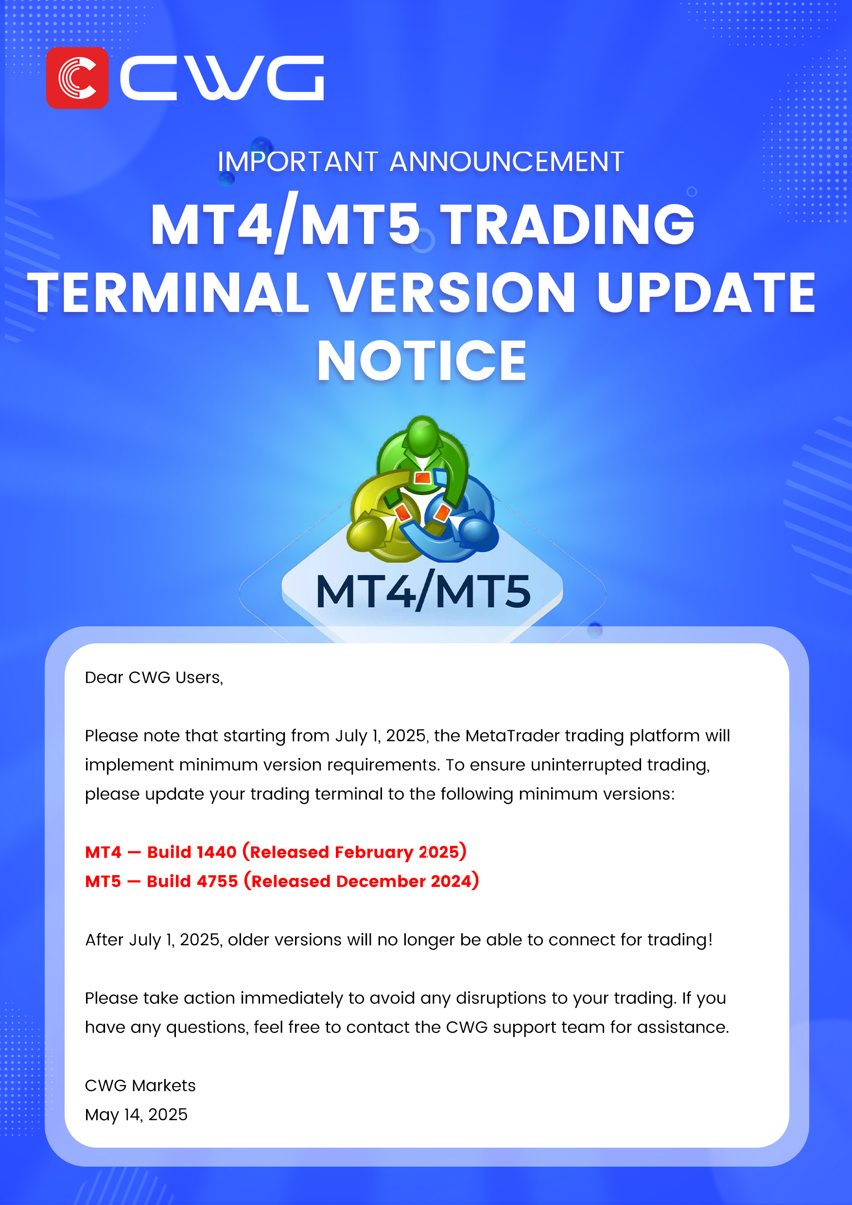 Important Announcement: MT4/MT5 Trading Terminal Version Update Notice