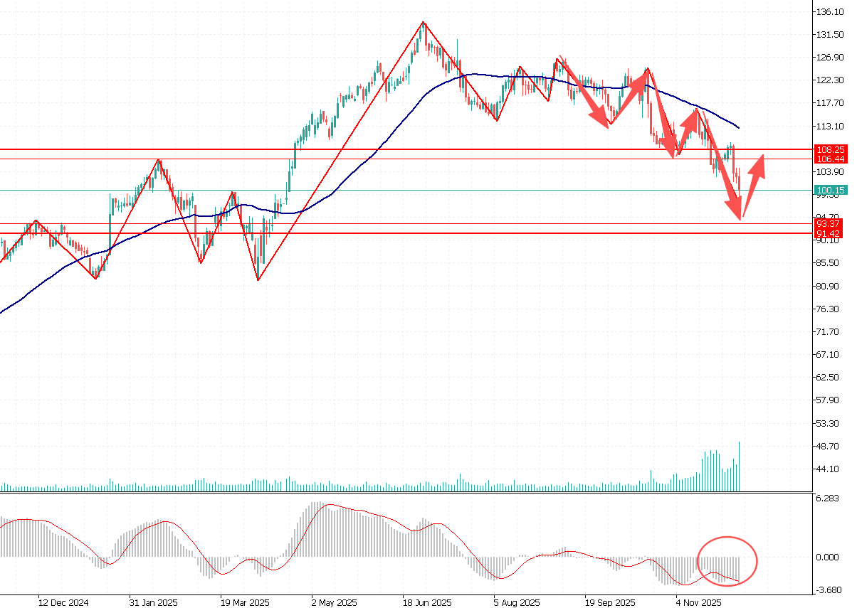 第一阻力位:105.00 第一支撑位:95.00