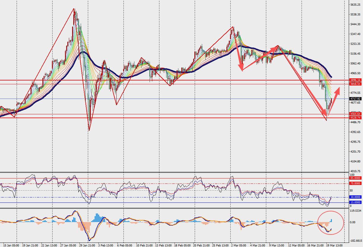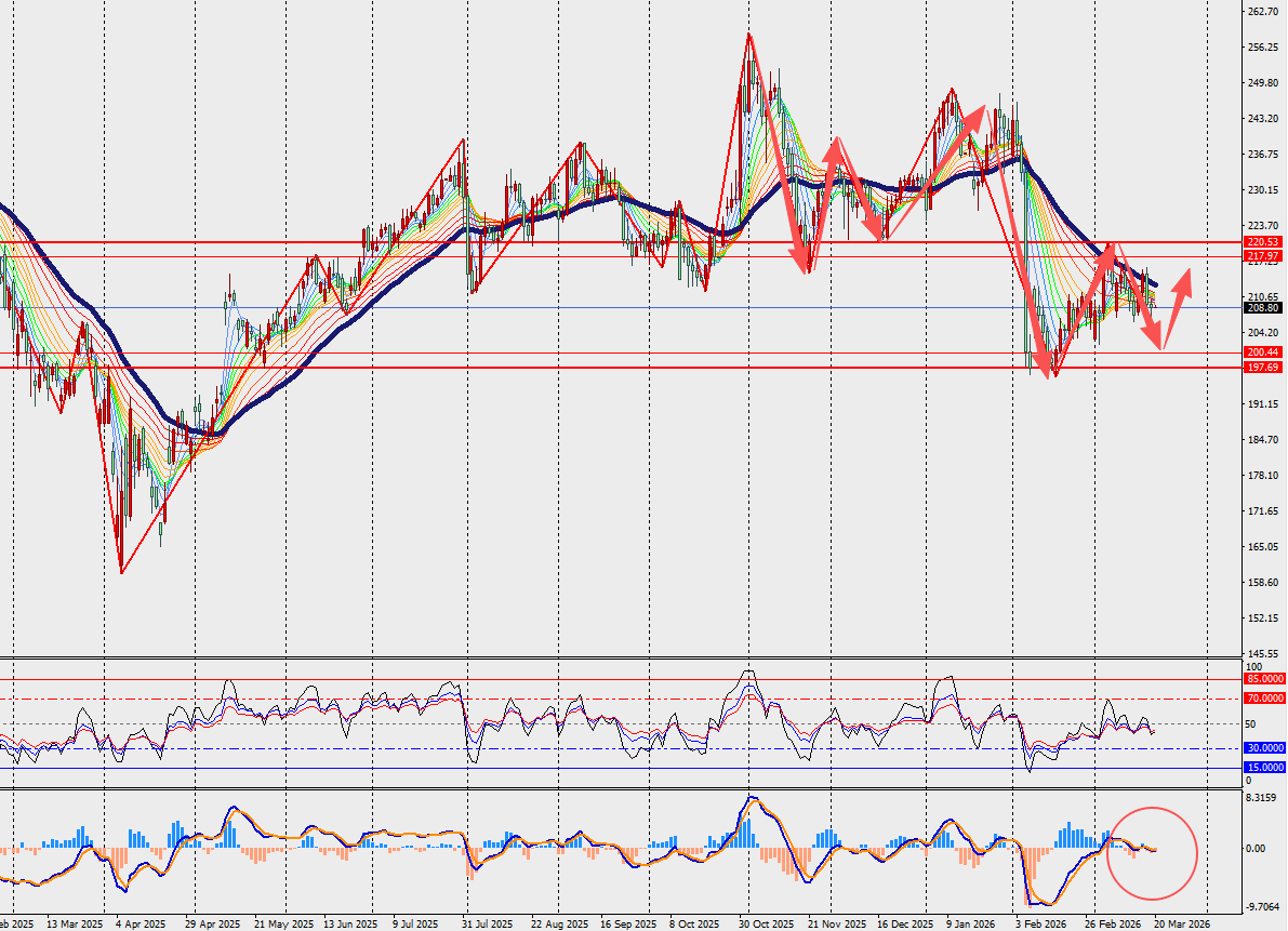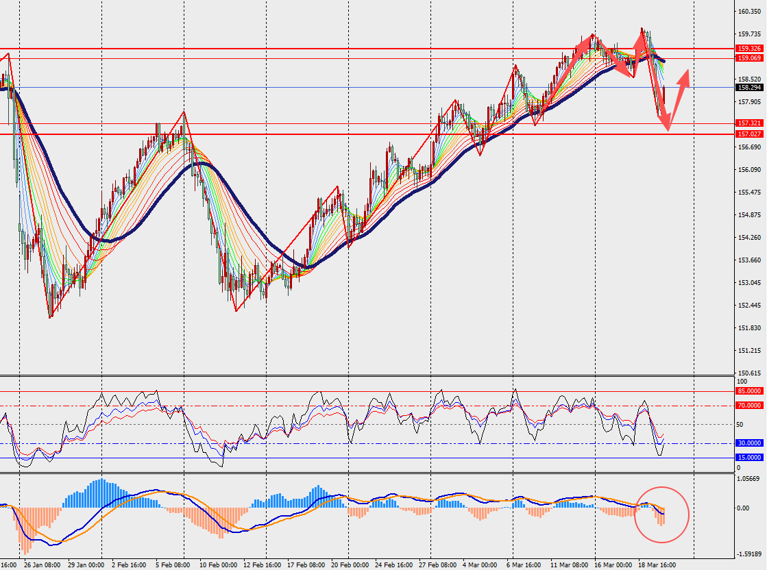 技术面:美元兑日元H4级别下跌反弹,并依旧在48日多空分界线下方运行。此外,MACD双线和量能柱在零轴附近收敛。日本作为能源进口依赖度最高的国家之一,油价上涨直接推升进口成本,加剧输入性通胀压力,同时抑制消费与企业投资,形成滞胀风险。