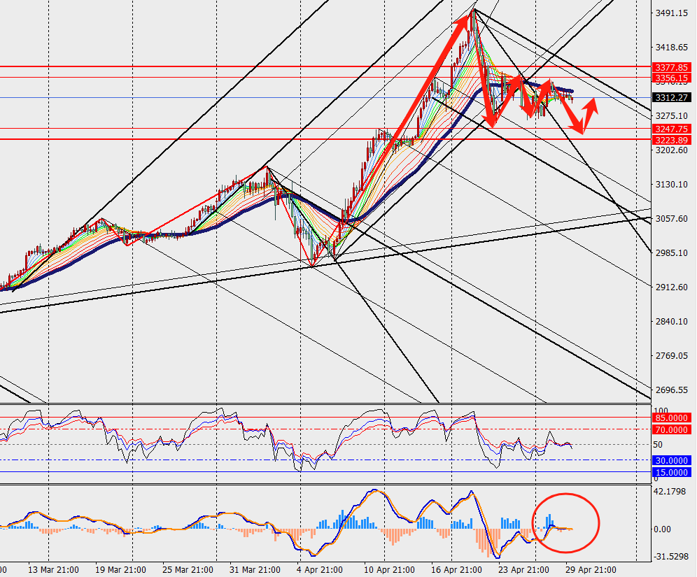 黄金H4级别维持震荡,MACD双线和量能柱在零轴附近收敛。在美国经济数据轮番轰炸之前,市场似乎正避免对美元和黄金进行任何新的方向性押注。如果黄金多头守住上述3300美元的通道支撑位,那么金价将不可避免地反弹至3370美元的固定阻力位。若能持续回升,后续目标将指向3400美元,乃至3500美元的历史高点。