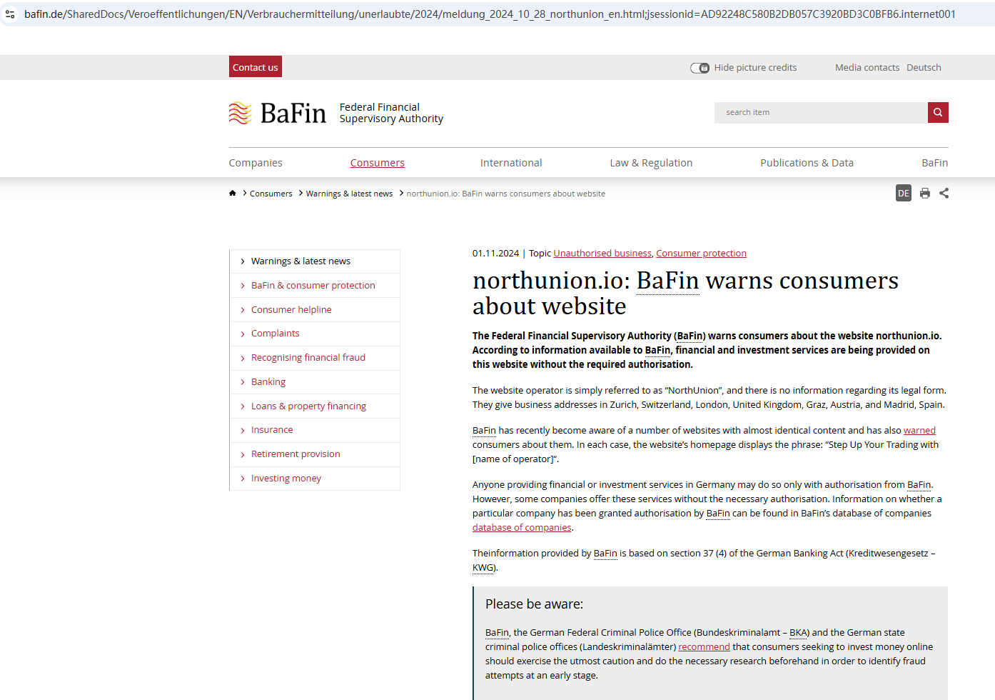 또한 연방 금융 감독 기관(BaFin)은 필요한 승인 없이 금융 및 투자 서비스를 제공하는 회사 NorthUnion(northunion.io)이 제공하는 서비스에 대해 소비자에게 경고했습니다.