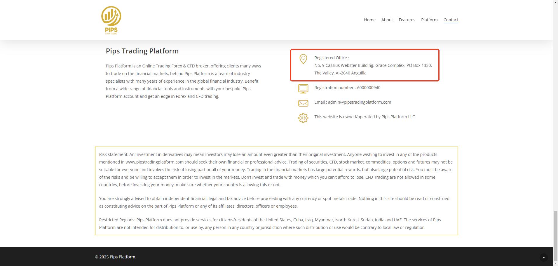 Pips Platform은 어떠한 규제 기관의 허가도 받았다고 주장하지 않으며, 단지 앵귈라에 등록되어 있다고만 주장합니다. 앵귈라 상업 등기부에 동일한 이름의 회사가 등록된 것은 확인되었지만, 이는 법인 등록일 뿐 유효한 금융 라이선스를 의미하는 것은 아닙니다. 규제를 받지 않는다는 것은 사기 행위의 주요 징후입니다. 따라서 Pips Platform은 사기일 가능성이 높습니다.