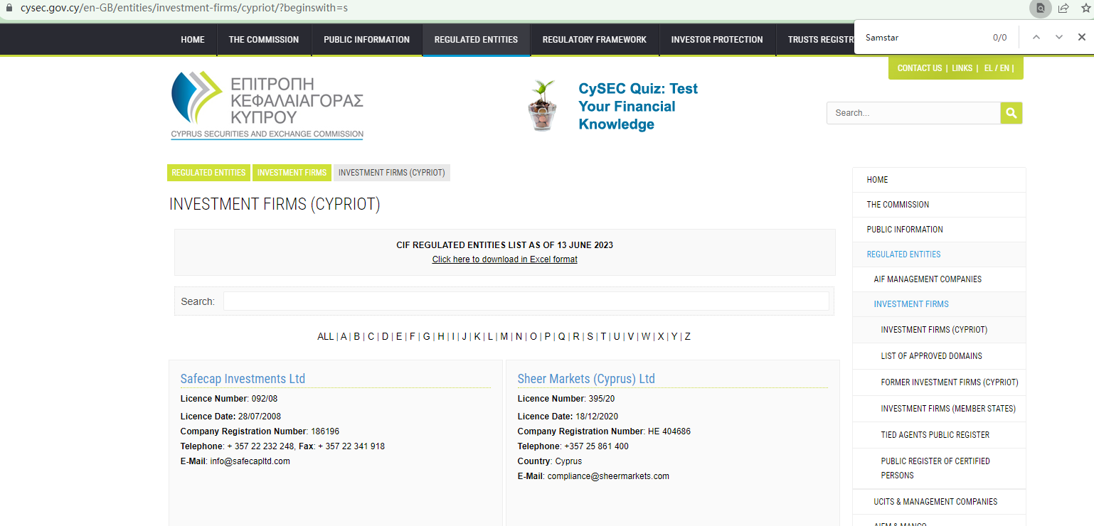 SAMSTAR CAPITAL은 규제 중개인이라고 잘못 주장합니다.금융 행동 당국 (FCA), 키프로스 증권 거래 위원회 (CySEC), 바하마 증권 위원회 (SCB) 및 금융 부문 행동 당국 (FSCA)에 의해 규제되고 있다는 주장은 근거가 없으며, 위 규제 기관의 등록에서 이 브로커를 검색하면서 어떤 일치하는 기록도 반환하지 않았습니다.