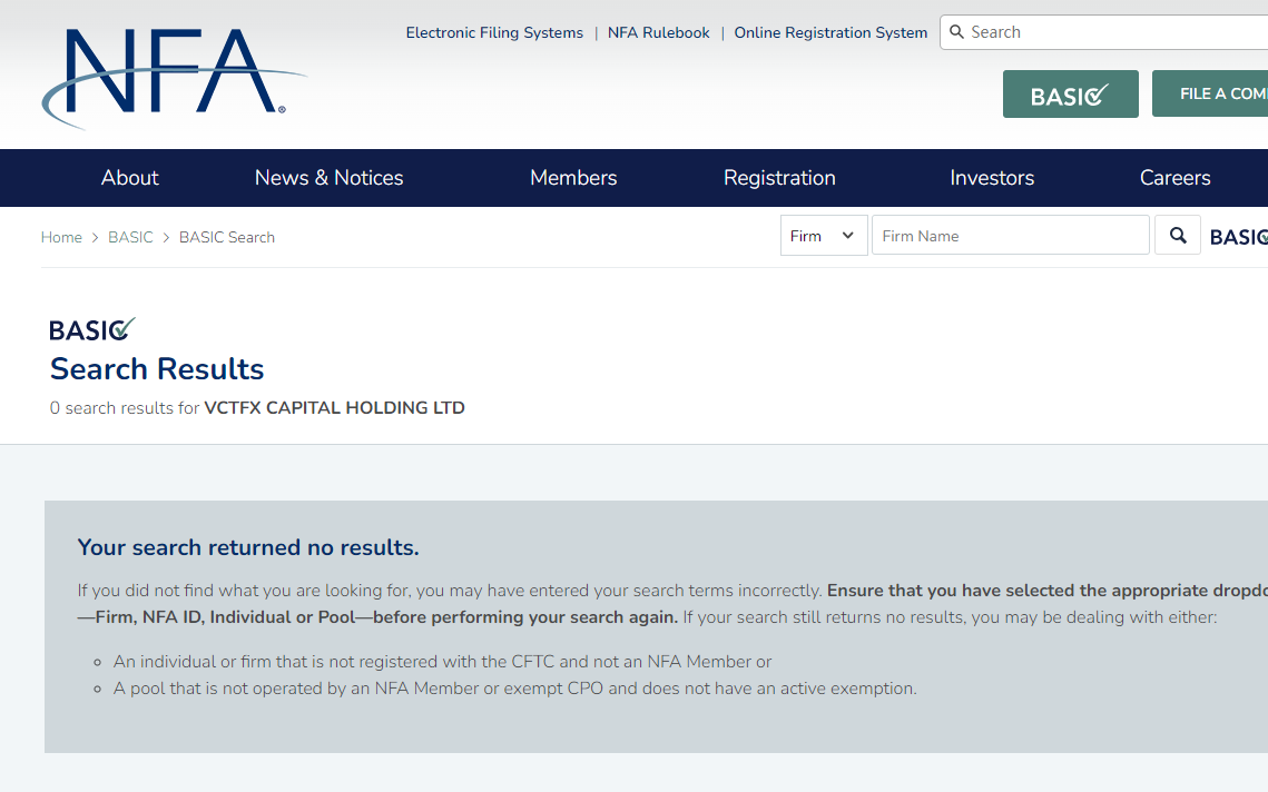 웹사이트에 따르면, 이 회사는 VCTFX Capital Holdings Ltd에서 운영하며 미국에 위치하고 있습니다. 조사 결과, National Futures Association(NFA)에서 일치하는 정보를 찾을 수 없었습니다.