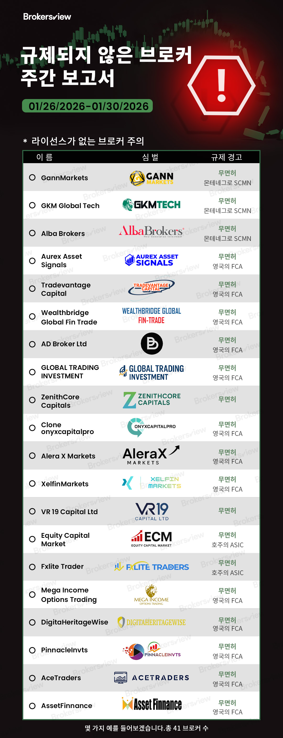 BrokersView가 2026년 1월 26일부터 2026년 1월 30일까지 적발한 사기 브로커 목록 :