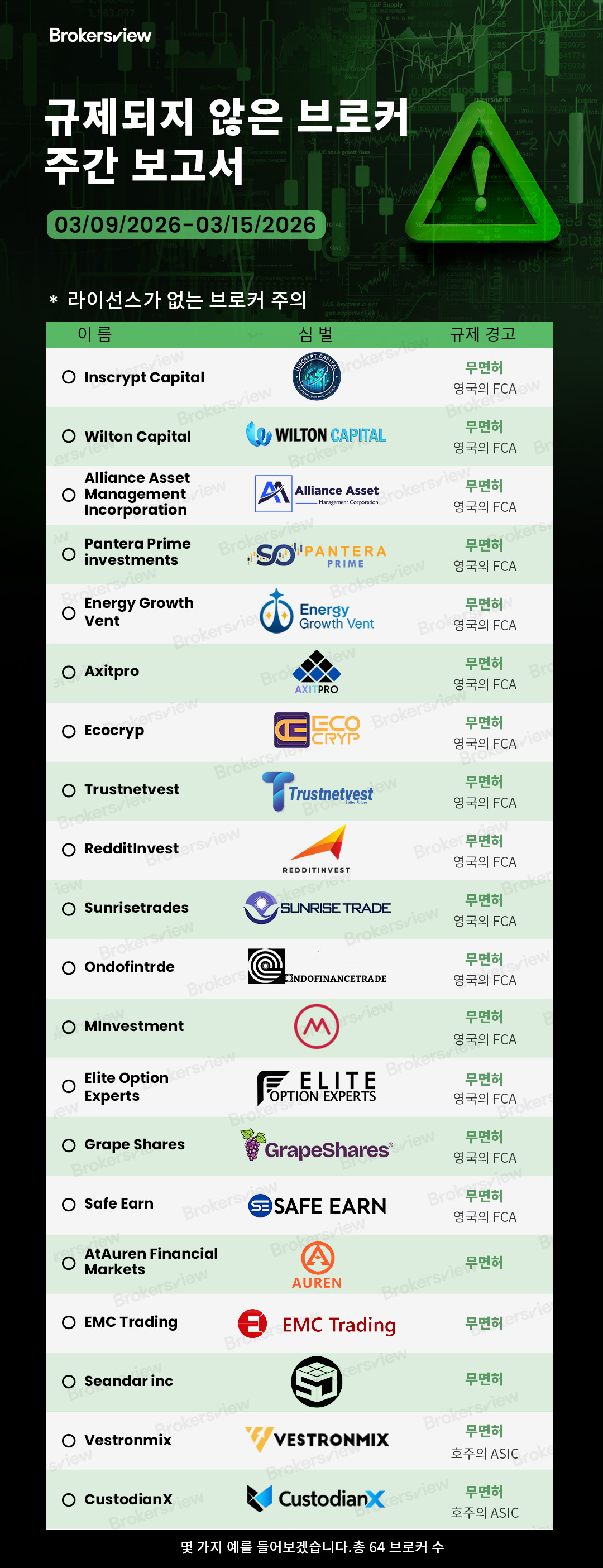 BrokersView는 2026년 3월 9일부터 15일 사이에 다음과 같은 무허가 브로커를 보고했습니다 .