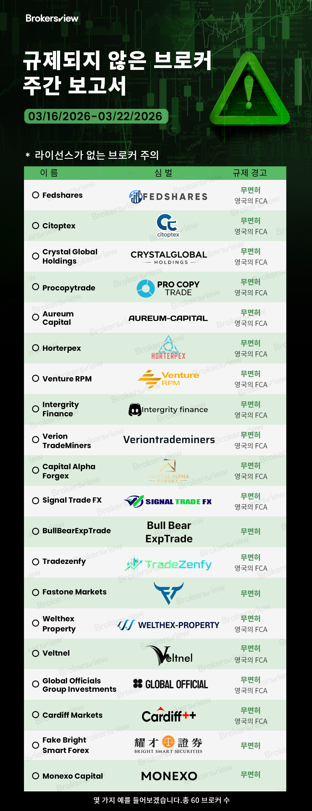 브로커스뷰는 2026년 3월 16일부터 22일까지의 한 주 동안 규제 당국의 승인 없이 운영되거나 영국 금융감독청(FCA)으로부터 공식 경고를 받은 60개 업체의 목록을 작성했습니다.
