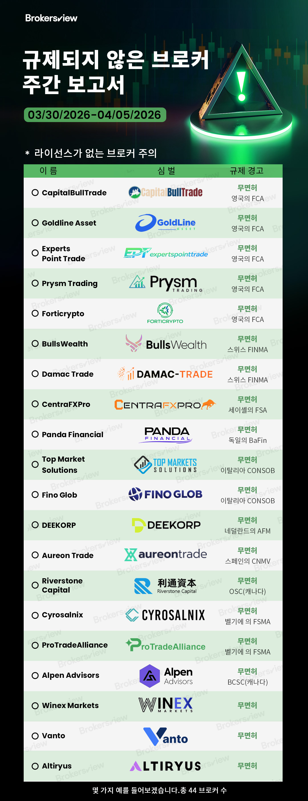 또 한 주가 지나고, 또 다른 사기성 브로커들이 음지에서 퇴출되었습니다. 3월 30일부터 4월 5일 사이, Brokersview는 적절한 허가 없이 운영되거나 규제 대상 기업의 위장 플랫폼을 사용하는 44개의 무허가 브로커를 적발하고 그 실체를 폭로했습니다. 이 플랫폼들은 영국 금융감독청(FCA), 독일 금융감독청(BaFin), 이탈리아 금융감독위원회(CONSOB), 스위스 금융시장감독청(FINMA) 등 주요 규제 기관의 경고를 받은 바 있습니다.