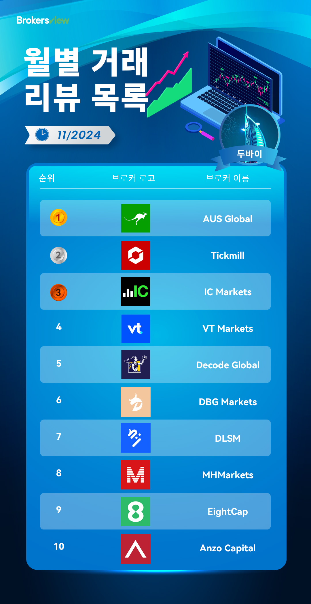 11월에 BrokersView는 주요 거래 범주에 걸친 브로커 성과에 대한 심층 평가를 실시했습니다. 결과에 따르면 AUS Global이 가장 높은 성과를 보였으며, 그 뒤를 Tickmill과 IC Markets가 이었습니다. AUS Global과 IC Markets는 모두 11월에도 강력한 순위를 유지하며 꾸준한 우수성을 보여주었습니다.
