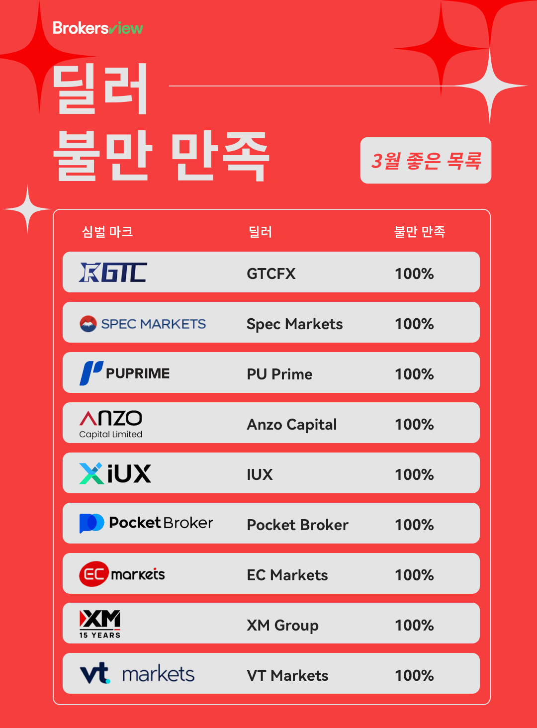 9명의 브로커가 3월에 100% 고객 불만 해결률을 달성하여 고객 서비스 및 문제 대응에 대한 강력한 의지를 보여주었습니다.