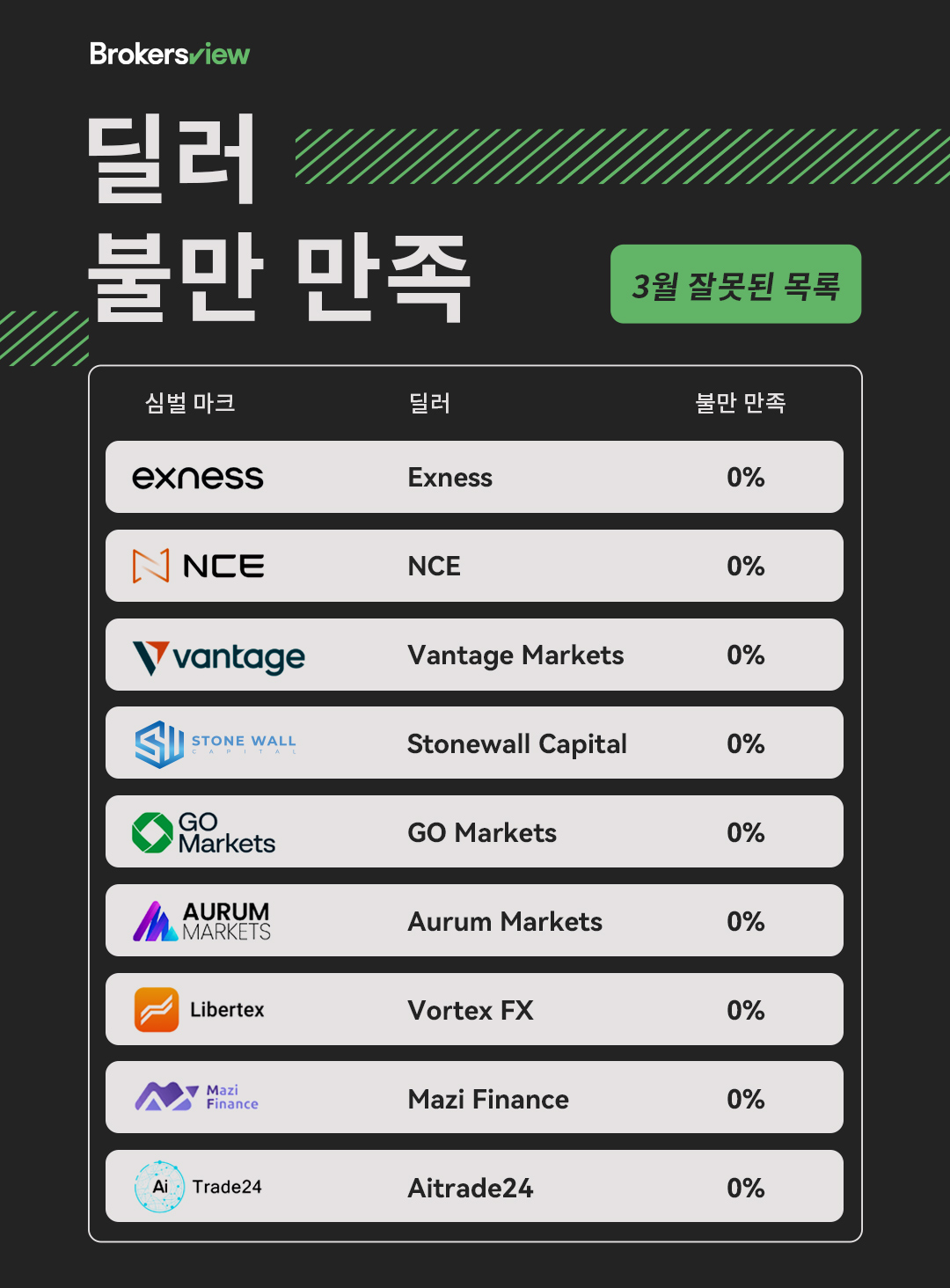 BrokersView가 발표한 최신 월간 순위에 따르면 2026년 3월에는 브로커들의 고객 불만 처리 실적에서 뚜렷한 격차가 나타났습니다.