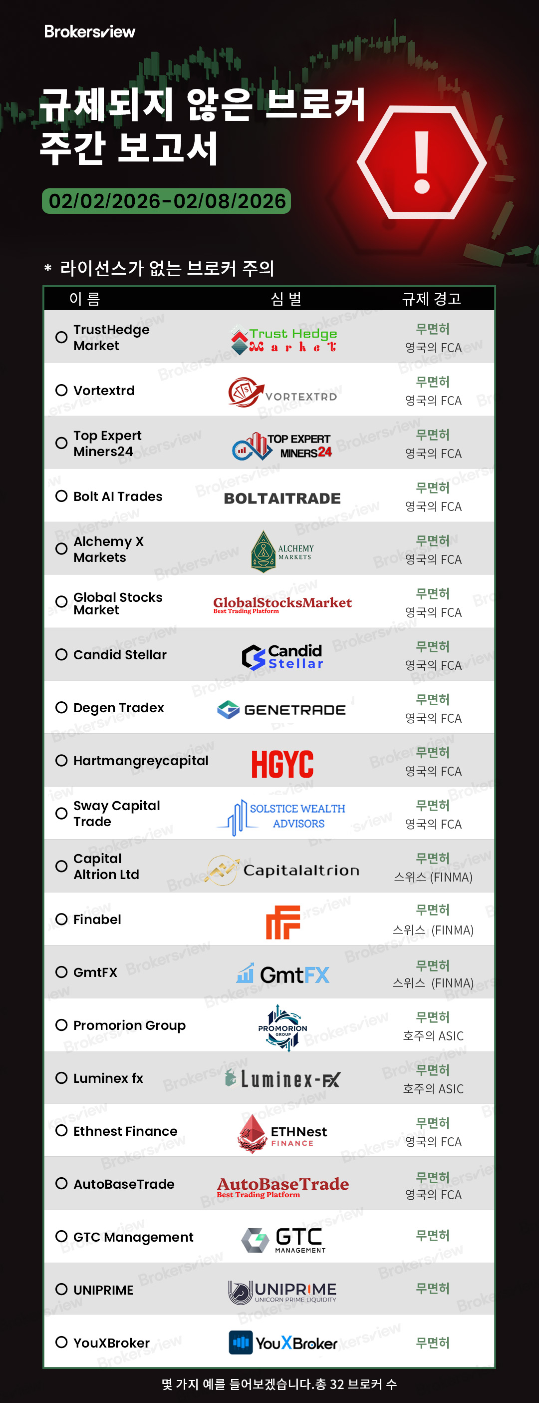 BrokersView에서 2026년 2월 2일부터 8일 사이에 보고된 무허가 브로커 목록 :