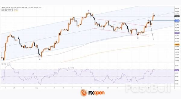 4시간 차트의 200일 및 400일 이동평균선에서 알 수 있듯이 일본 주식 시장은 장기 상승 추세를 유지하고 있습니다. 이번 여름, 지수 움직임은 파란색으로 강조된 상승 채널을 형성하고 있으며, 하단 경계선이 강력한 지지선 역할을 하고 있습니다.