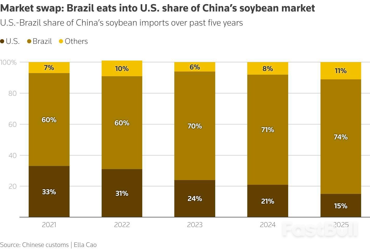 중국 농림수산부에 따르면 중국의 2025/26년 대두 수입량은 2024/25년의 1억 937만 톤에서 9580만 톤으로 감소할 것으로 예상되지만, 브라질은 그보다 더 큰 비중을 차지할 것으로 전망된다.