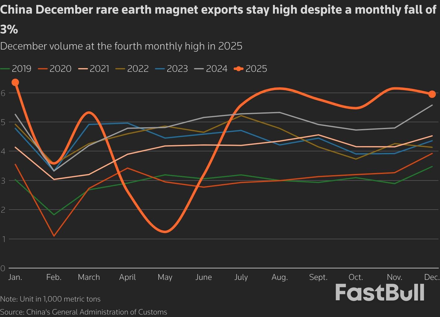 전월 대비 감소세에도 불구하고 12월 거래량은 2024년 같은 달보다 31.4% 증가했습니다. 분석가들은 이러한 전년 대비 급증은 일본 구매자들이 중국의 추가 무역 제한 조치를 예상하여 자재를 비축한 데 따른 것으로 보고 있습니다.