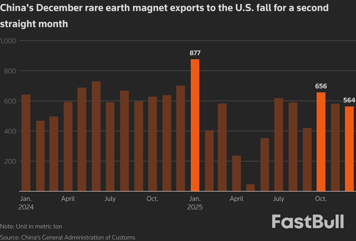 12월 데이터는 미국으로의 수출 감소세도 드러냈습니다. 희토류 자석 수출량은 전월 대비 3% 감소한 564톤을 기록했습니다.