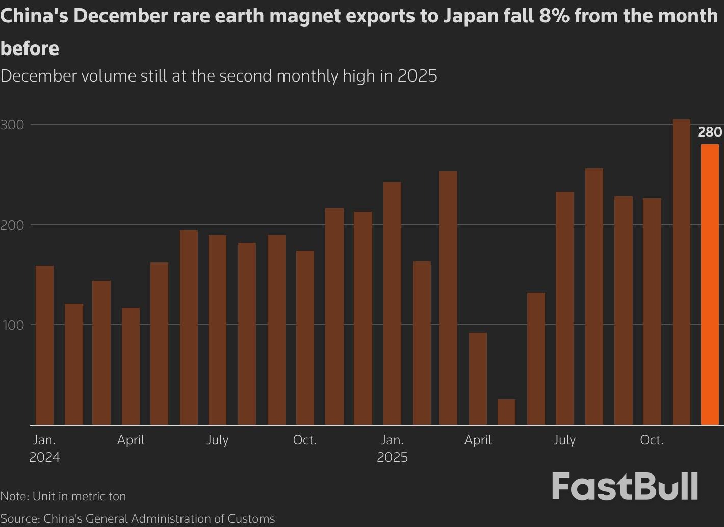 중국 해관총서 자료에 따르면 12월 중국의 일본 수출 희토류 자석 물량은 280톤을 기록했다. 이는 11월에 기록한 2025년 최고치인 305톤보다 감소한 수치이다.