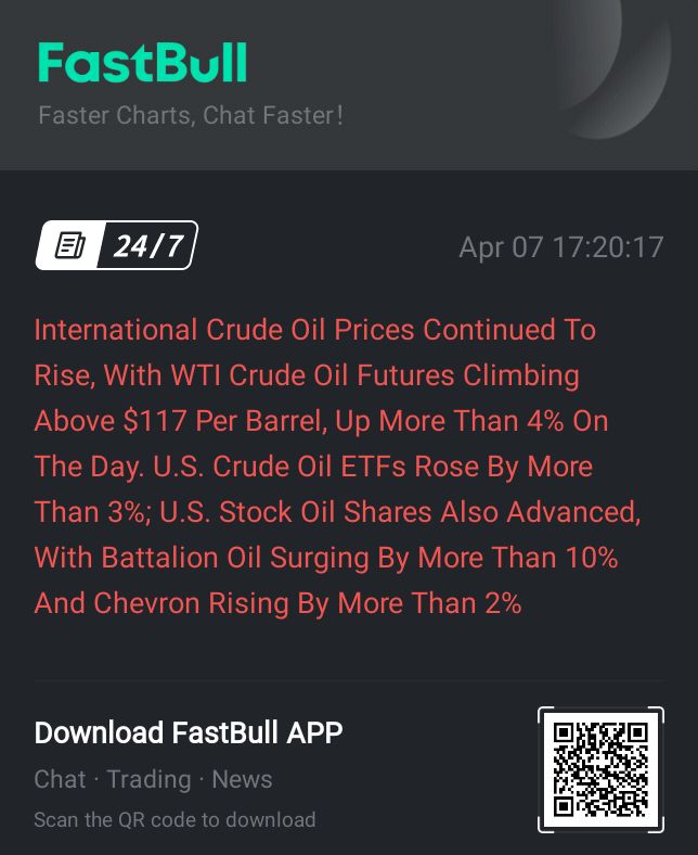 Harga Minyak Mentah Antarabangsa Terus Meningkat, Dengan Niaga Hadapan Minyak Mentah WTI Mendaki Melebihi $117 Setong, Meningkat Lebih Daripada 4% Pada Hari Ini. ETF Minyak Mentah AS Meningkat Lebih Daripada 3%; Saham Minyak Saham AS Juga Meningkat, Dengan Battalion Oil Melonjak Lebih Daripada 10% Dan Chevron Meningkat Lebih Daripada 2%