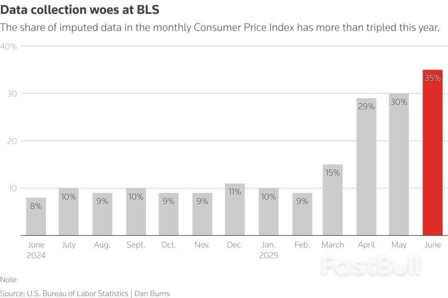 Penggantungan pengumpulan data berlaku selepas bertahun-tahun yang disifatkan ramai sebagai kekurangan pembiayaan BLS di bawah pentadbiran Republikan dan Demokrat. Memetik keperluan untuk "menjajarkan beban kerja tinjauan dengan tahap sumber," BLS menggantung pengumpulan data CPI sepenuhnya di satu bandar di Nebraska, Utah dan New York. Ia juga telah menggantung pengumpulan 15% daripada sampel di 72 kawasan lain, secara purata. Bahagian imputasi sel yang berbeza dalam data CPI - pada asasnya memodelkan andaian tempat harga mungkin - melonjak kepada 35% pada bulan Jun daripada 30% pada bulan Mei. Trump pada hari Isnin berkata beliau mencalonkan ahli ekonomi Yayasan Warisan EJ Antoni sebagai ketua BLS yang baharu.
