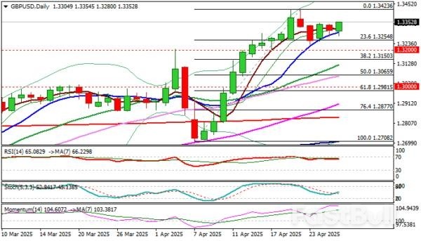 Series of higher lows since 1.3232 correction low, with fresh recovery being tracked by ascending 10DMA add to near term bullish bias, with sustained break of 1.3350 needed to confirm that corrective phase is over, and larger bulls look for fresh attack at key 1.3434 barrier (2024 top).