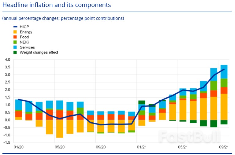 Eurostat's report released in September showed that annual HICP inflation in the euro area rose further to 3.4% in September, up from 3.0% in August, and well above the ECB's stated inflation target. The euro-area inflation is expected to rise further by the end of this year. The inflation spike is mainly affected by three factors: one, the reopening of the euro area economies so that the strong will to recover, demand is stronger than supply leading to higher commodity prices. Second, energy prices rose sharply, accounting for about half of the overall inflation in September. In particular, crude oil prices rose, with OPEC failing to meet its targets in August and September and supply weakening. Third, the base effect associated with the end of the German VAT cut is still pushing up inflation. Based on the combination of the above three factors, inflation in the euro area will remain high.