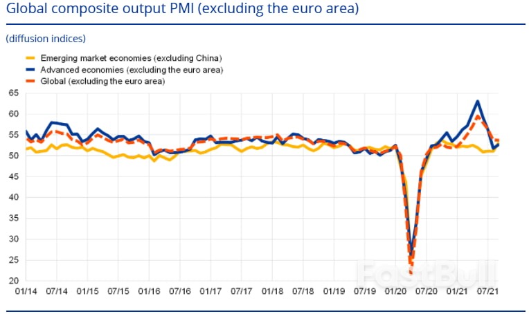 The global composite output Purchasing Managers’ Index (PMI) – excluding the euro area –confirmed that growth momentum moderated in the third quarter of 2021, although it remained well above its historical average. Specifically, industrial production momentum continued to soften in advanced economies in July. Growth momentum in emerging market economies remained softer than in advanced economies, especially in the manufacturing sector.