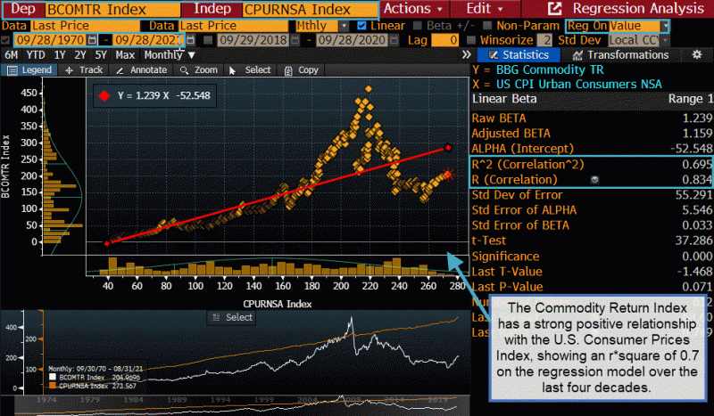 As inflationary pressures have increased, historically, there has been a strong correlation between inflation and commodity prices. For example, the commodity return index has a strong positive correlation with the U.S. Consumer Price Index. The regression model shows an r*square of 0.7 over the last 40 years. A positive reading of 1 implies that security prices are in step.