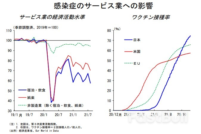 This summer, affected by a dramatic increase in the number of infections dute to the spread of the highly contagious Delta variant, the public vigilance against COVID-19 heightened. As a result, food, drink and accommodation services became subdued by about 40 percent below the pre-pandemic level. Japan's vaccination rates now have steadily risen to more than 70 percent, exceeding the levels in Europe and the United States. As a marked decrease in the number of confirmed cases, restrictions on various activities have been gradually eased since last month.