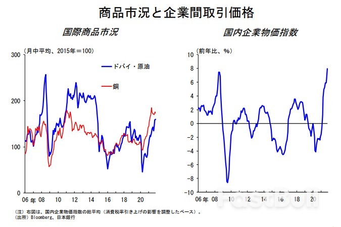 International prices for a wide range of commodities, such as crude oil and natural gas, have been surging recently, reflecting a combination of factors including a sharp recovery in global demand and supply, and the crude oil production has continued to be reduced. The upward pressure on global commodity prices has increased significantly overall due to labour shortages and logistic stagnation, as has Japan, where domestic corporate commodity prices have risen for the first time since 1981.