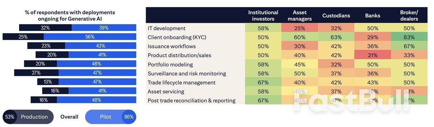 GenAI is also expected to play a part in the post-trade market with 57% of respondents indicating that their organizations are piloting the technology for post-trade operations.At least 67% of institutional investors indicated they use GenAI for post-trade reconciliation, reporting, clearing, and settlements.