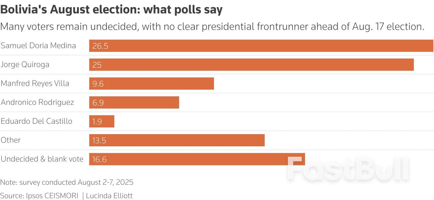 With a crowded field and no dominant MAS party candidate, the election marks a "crossroads moment" for Bolivia, said Southern Andes analyst Glaeldys Gonzalez Calanche of the International Crisis Group.Bolivia's fragile economy has been top-of-mind for voters. Price rises have surged past other Latin American countries this year, and fuel and dollars have run scarce.Annual inflation doubled to 23% in June, up from 12% in January, with some Bolivians turning to cryptocurrencies as a hedge.