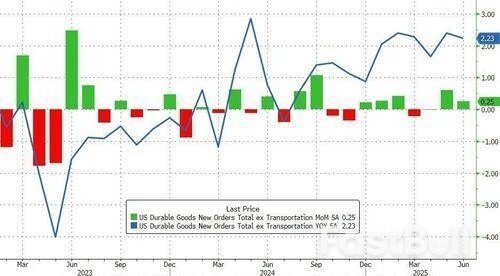 Excluding the noise of Boeing orders, the data was actually solid with a 0.25% MoM increase (better than the 0.1% rise expected) in durable goods orders (ex-Transports), pushing YoY orders uo 2.23%