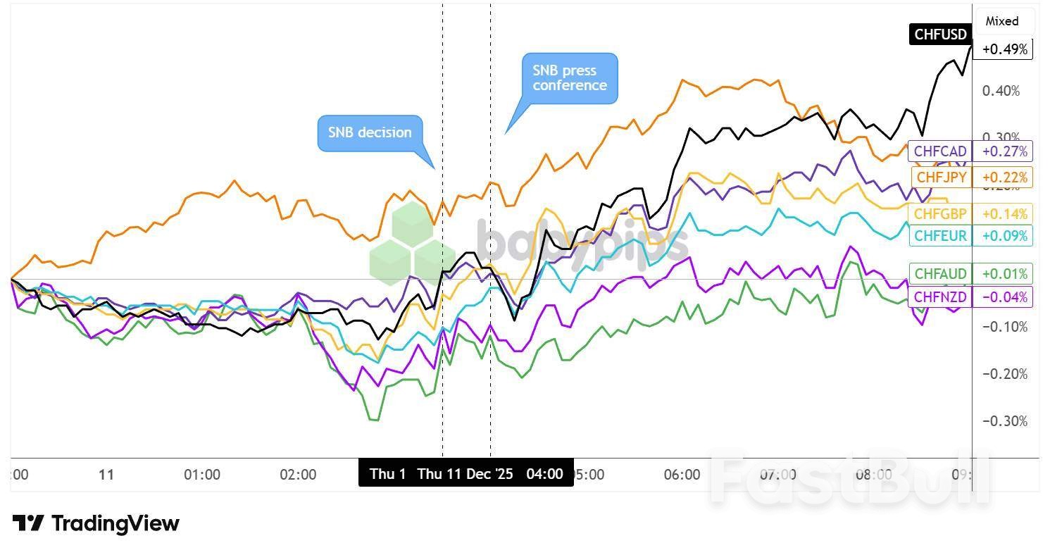 CHF briefly pulled back during the press conference, as traders likely weighed the implications of avoiding further easing amid a weaker inflation outlook, while also assessing the central bank's willingness to intervene in the currency market "as necessary."