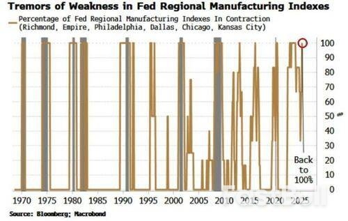 One notable point can be found in the Federal Reserve’s regional manufacturing indexes. Individually they are very volatile. But when they act in concert, they give a more reliable indication. The combined signal has recently jumped back to 100%, with all the indexes now in the contraction zone.