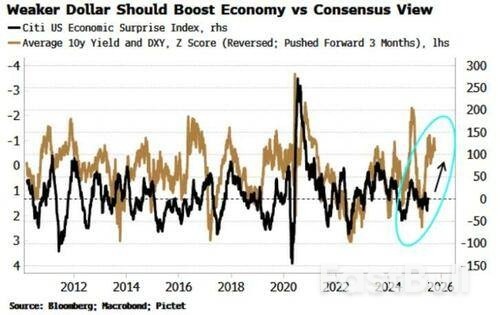 More broadly, though, dollar weakness and (at least for now) relatively stable yields are typically consistent with economic data improving relative to the consensus.
