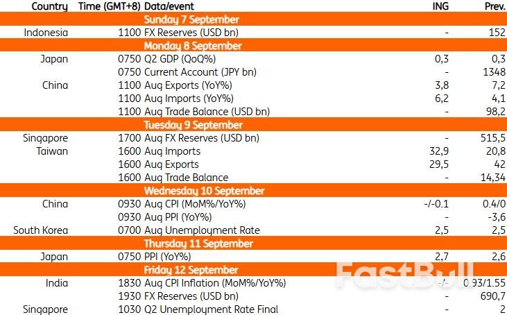 On Monday, we don’t expect major surprises from China’s August trade data in light of the extension of the US-China trade war truce, which kept tariffs at the status quo. Export growth could slow to around 3.8% year on year, while imports could continue to pick up to around 6.2% YoY, thanks to base effects from 2024.August inflation data, to be released on Wednesday, could show price pressures dipped back into negative territory at around -0.1% YoY after coming in at zero in July.