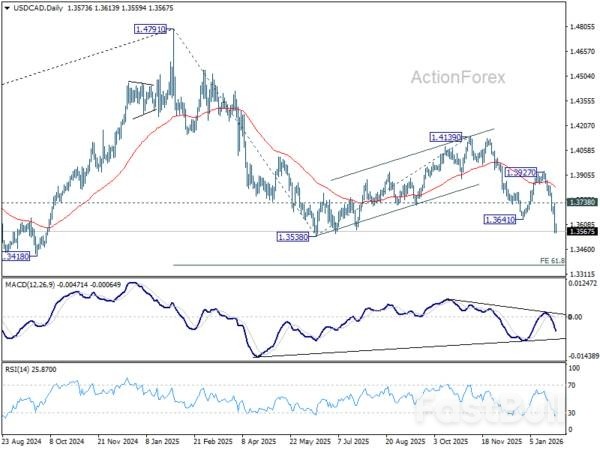 Two major central bank decisions from North America headline the day, with both the BoC and the Fed widely expected to keep interest rates unchanged. USD/CAD, meanwhile, is unlikely to see its broader trend altered by either decision. The current selloff would likely continue through 1.3538 low as driven by the overall selloff in Dollar.
