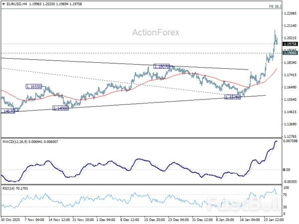 EUR/USD's rally is still in progress and breached 1.2 psychological level before retreating slightly. Intraday bias stays on the upside. Decisive break above 1.2 will carry larger bullish implications. Next near term target will be 38.2% projection of 1.0176 to 1.1917 from 1.1576 at 1.3434. On the downside, below 1.1906 minor support will turn intraday bias neutral first. But outlook will stay bullish as long as 1.1576 support holds, even in case of deep pullback.