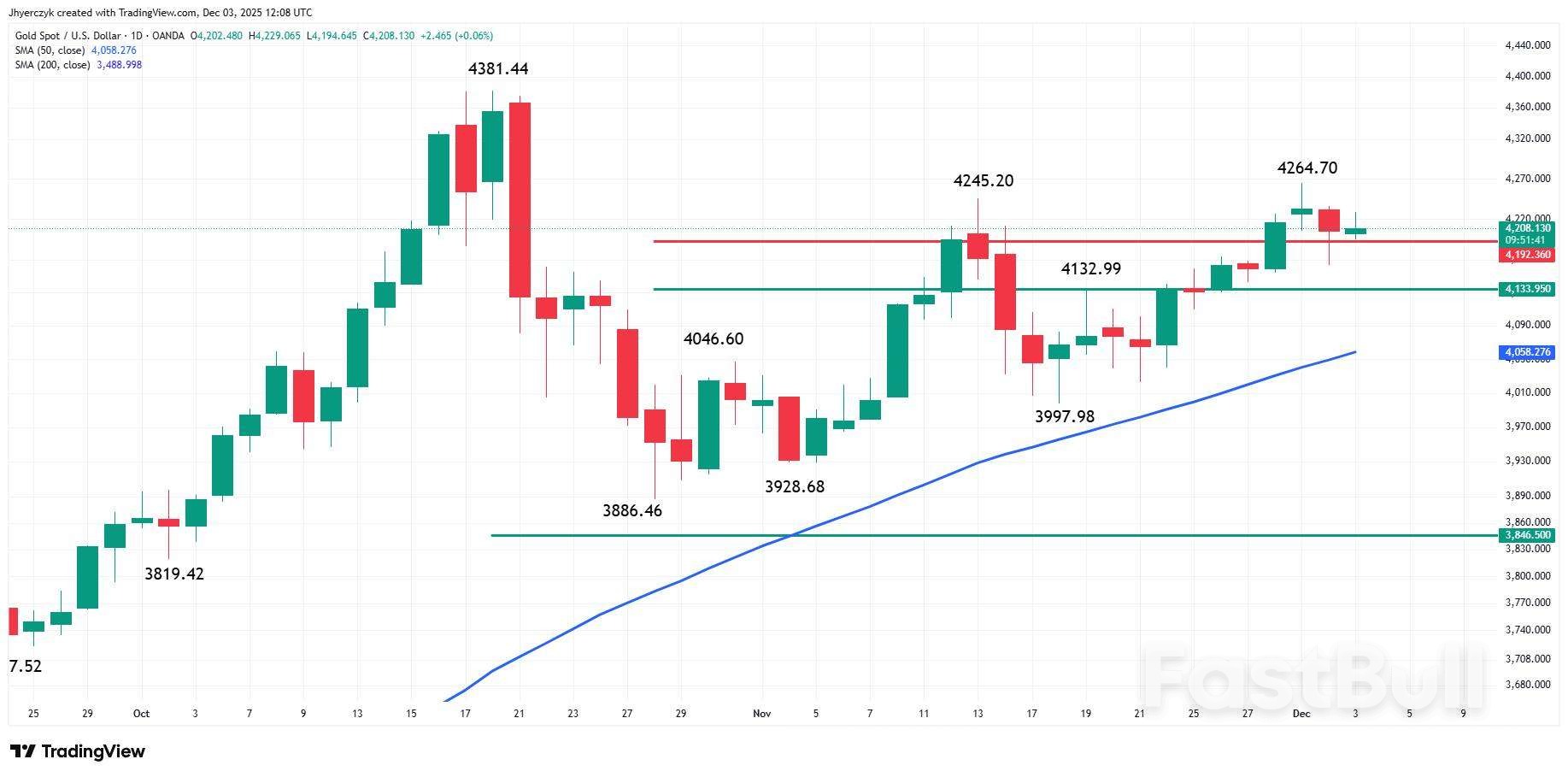 Gold's holding support, the Fed's dovish, and the dollar's weak. The setup favors the bulls, but the breakout isn't confirmed yet. This week's data will either push gold through $4,264.70 toward the record — or give dip-buyers one more entry before year-end. Either way, the 50-day moving average is the line that matters. As long as that holds, buyers have the upper hand.