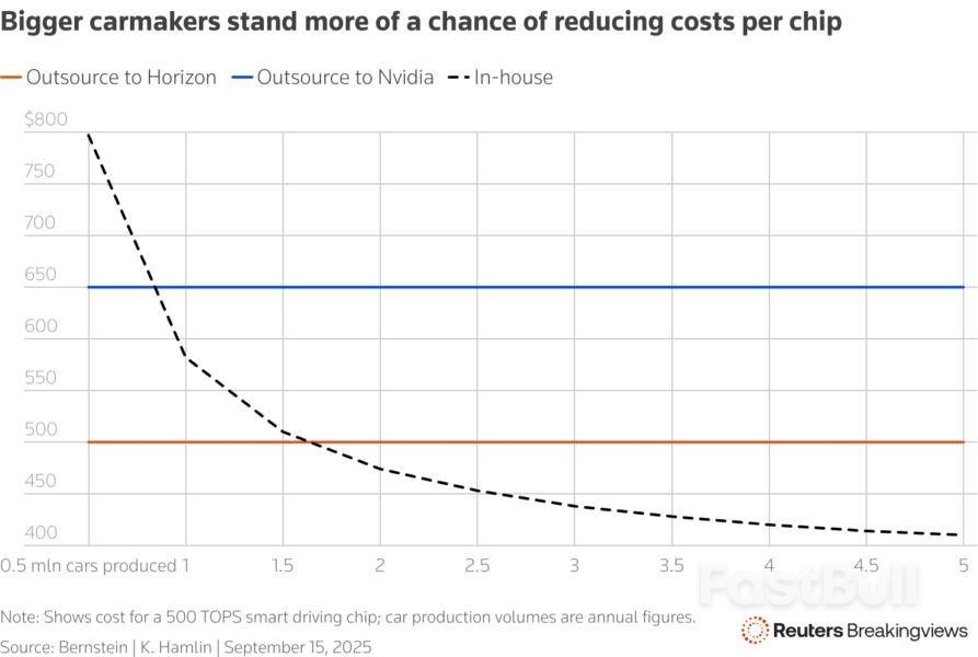 But the financial case is harder to justify, because outsourcing is simply cheaper and more efficient. Developing a chip can take five years or more, per consultancy AlixPartners. And it will require hiring thousands of engineers. BYD's intelligent driving team, for instance, has swelled to over 4,000 people covering both software and hardware. Analysts at Bernstein estimate that only auto manufacturers with annual production exceeding 1.5 million vehicles stand any chance of being able to make in-house chips more cost-effective than buying from Nvidia or Beijing-based Horizon Robotics.