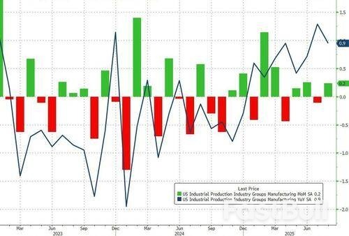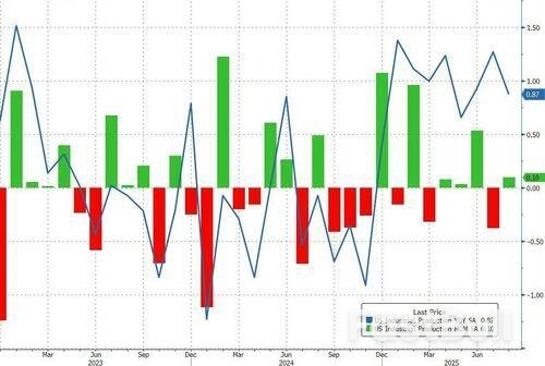 US Industrial production rose 0.1% MoM in August (better than the small 0.1% MoM decline expected) and a modest rebound from July's weakness. YoY growth in production dipped to 0.9%...