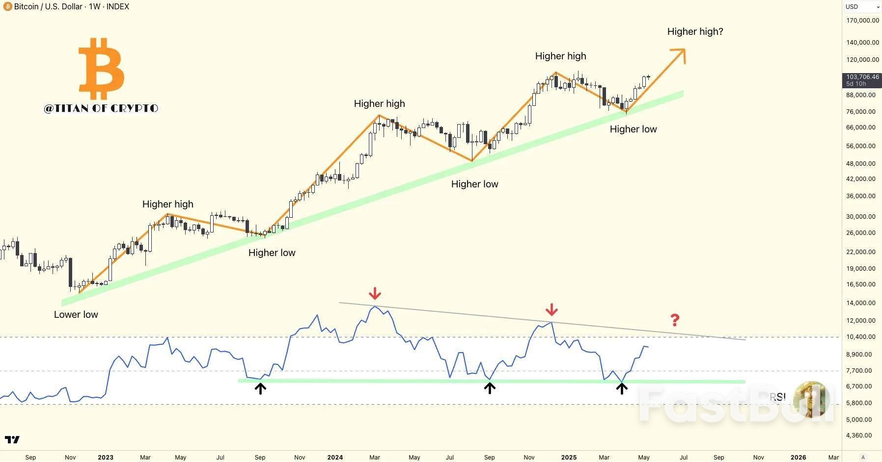 Although the price response was mild, technical analysts remain optimistic. Noted crypto analyst Titan of Crypto shared the following chart indicating a potential move to new all-time highs, driven by a strengthening weekly Relative Strength Index (RSI).