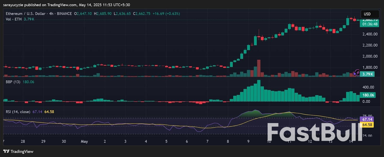ETH chart (Source: TradingView)The altcoin’s daily relative strength index (RSI) at 67.14 indicates that the asset is approaching the overbought territory. This bullish momentum may face resistance or a potential pullback. Besides, Ethereum’s Bull Bear Power (BBP) reading of 180.06 suggests sturdy dominance of bulls in the market.