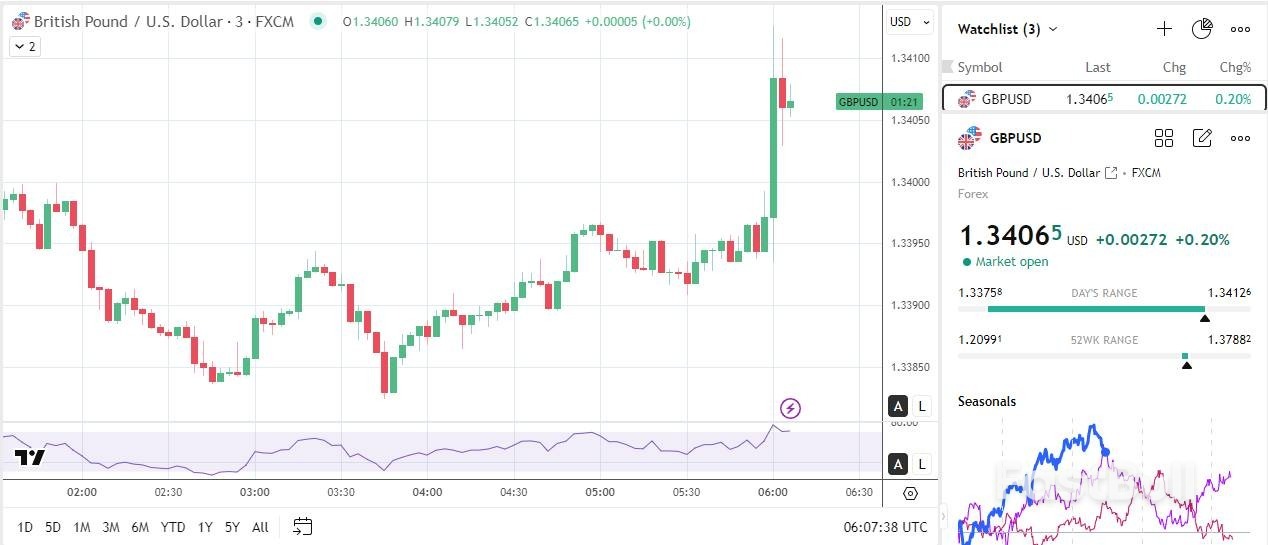 Ahead of the inflation report, the GBP/USD dropped to a low of $1.33758 before rising to a high of $1.34005. Following the report, the pair briefly dipped to a low of $1.33935 before surging to a high of $1.34126.