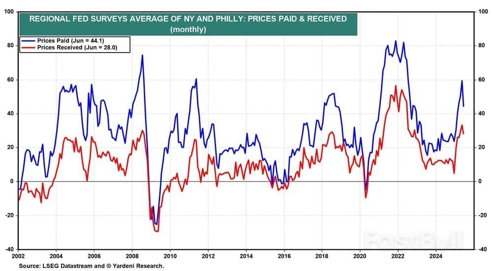 The average of June’s prices-received and prices-paid indexes for the New York and Philly Fed districts rose sharply earlier this year, but might have peaked in May, as both indexes dipped in June.