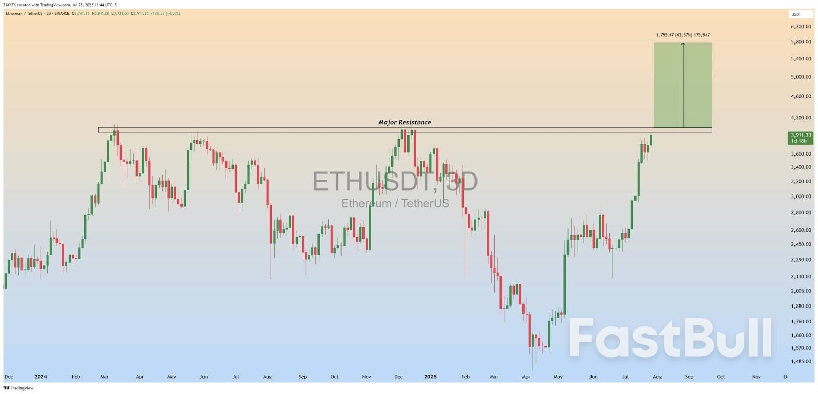 Crypto analyst ZAYK Charts notes that if Ethereum manages to break above $4,000, it could open the door for a potential surge toward the $6,000 mark, a significant increase from its current price.