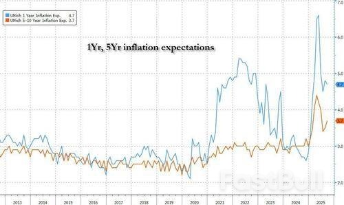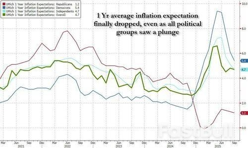 Specifically, we pointed out that while 1 Year inflation expectations across every single party tumbled (yes, even Democrats), the overall average was unchanged, with the report claiming that 1Yr inflation expectations were somehow 4.8%, even though Republicans were at 1.2%, Independents were below the average at 4.7% and Democrats, and their TDS hyperinflation delusions, were barely above it at 5.4%. How you get 4.8% based on this was unknown to anyone.