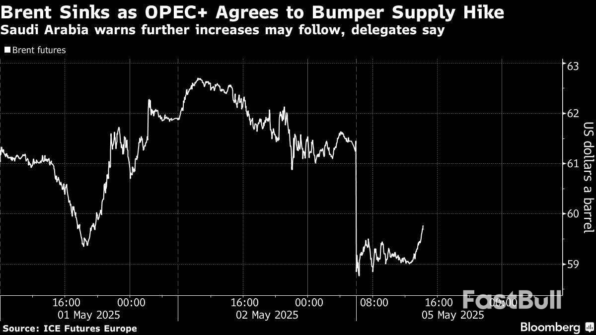 Brent futures tumbled as much as 4.6% toward $58 a barrel, before paring losses. OPEC and its allies agreed Saturday to continue loosening supply constraints as the group’s leaders seek to punish overproducing members and win back market share.