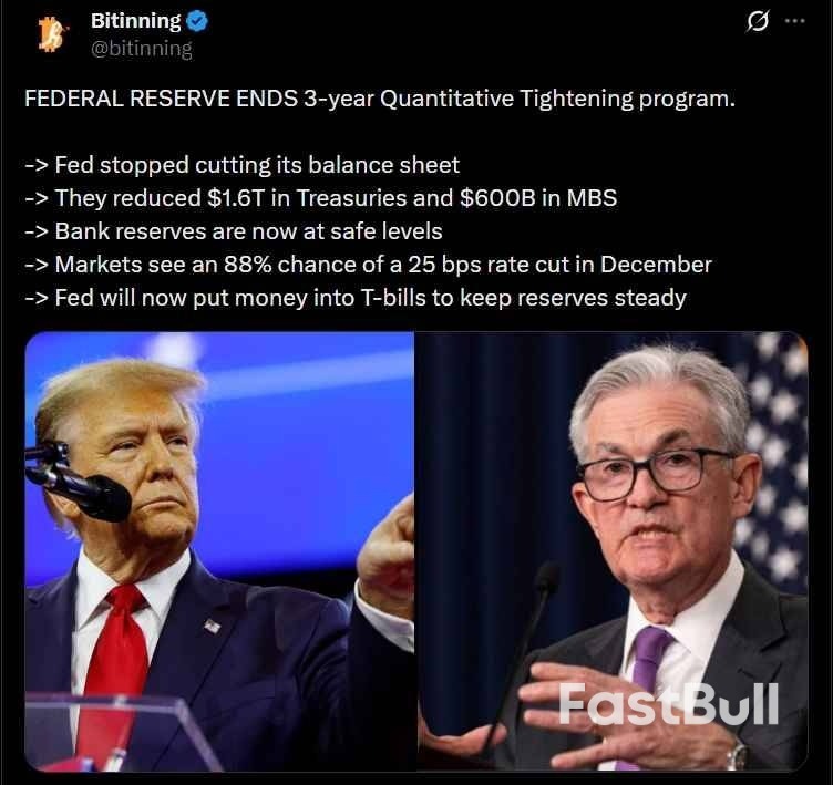 The Federal Reserve's decision to end its three-year QT cycle and shift toward liquidity support is being viewed as a bullish catalyst across the crypto assets. Traders expect improved dollar funding, higher risk appetite, and a potential December rate cut—all factors that typically boost digital assets.